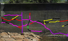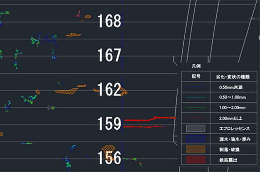 ひび割れ等を抽出することで、図示または凡例を用いて表すことができます。
