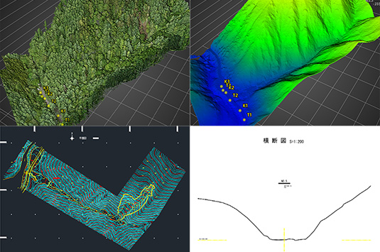 インフラ建設時の測量や維持管理点検、災害現場の復旧など幅広くサービスを提供しています。