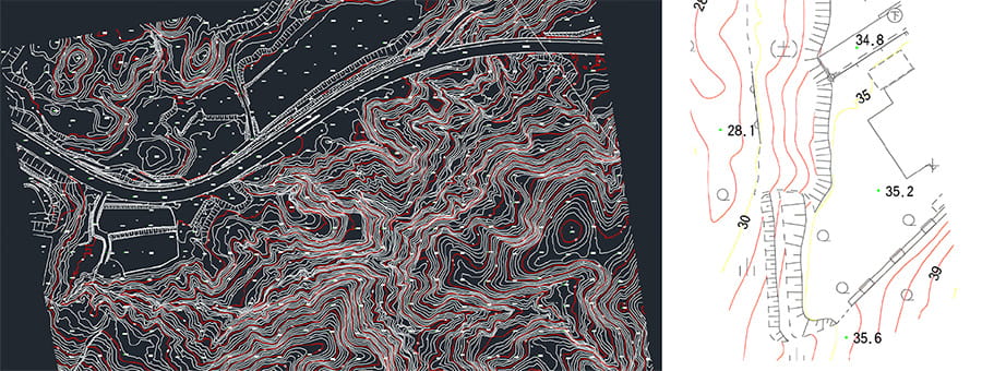 計測や解析の成果物として、点群およびオリジナルデータ、グラウンドデータ、等高線図や数値地形図等の各種図面を作成いたします。
